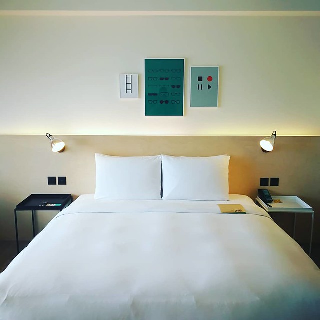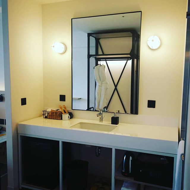 打開大門,是一間非常寬敞開揚的客房,studio式的開放設計令空間感倍增。我很喜歡客房內的黑白色輕工業風設計,偶爾又點綴了一些色彩豐富的藝術裝飾。除了柔軟而且超大的床,窗旁還放了一張非常舒服的貴妃椅,望出窗外便是台北101的美麗風光。