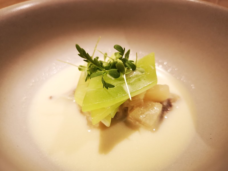 This dish is prepared using Italian cooking techniques. The mackerel was served with a vegetarian sazu and radish, a garlic cream, and a white broth made from beef, clams and radish. The half-cooked fish was very tender, but had a slightly fishy mackerel-like flavour that not everyone liked. I found it quite tasty, and the broth was a bit fatty, which made it more moist, but the broth was a bit off-putting by the grassy taste of the radish. It was a bit sour to be served with Chardonnay white wine.