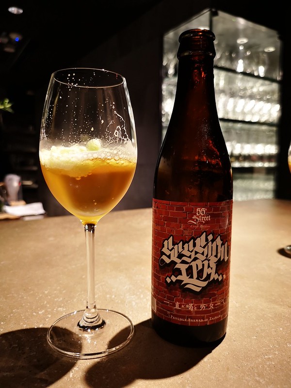 A very delicate dish. The horse head fish was cooked using the Taiwanese concept of salt-crusted chicken, sprinkled with salt-crusted spices and fried, the meat was crispy on the outside and soft on the inside, and even the scales of the fish were fried to a rare crispiness! The brown one on the side is a roasted mandarin orange, which has been roasted to enhance its flavour. Squeeze the juice onto the fish and dip it into the black garlic sauce to bring the flavour to the next level. A side dish of mildly spicy sticky peppers with a few Korean sesame leaves and kalamata adds to the flavour. The dish is complemented by Taiwan's craft beer "55th Street". The bitter taste of the beer chemically interacted with the flavour of the salt-crusted horse head fish, bringing out a rich floral aroma that lingered on the palate, and it was really delicious! Honestly, this fish was one of the best fish dishes I've ever had at a Michelin restaurant in Taipei.