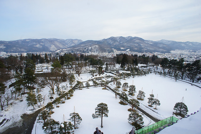 「會津若松城」又名「鶴城」,是日本百大名城的第十二座。「若松城」是日本唯一一座用紅棕色屋瓦的天守閣,屋頂上有鑲了金牙的鯱,建築以白色為主。城內有不少描寫戰爭及歷代城主事蹟的資料及文物展品,內庭園更有紀念古代陣亡戰士的碑塔,看似非常沉重,但它卻有著迷人的景緻,春天護城河兩旁及城內種了過千株櫻花,秋天滿佈紅葉,而冬天則被白雪覆蓋。另外,大家可參加彩繪當地吉祥物「紅牛」的體驗,有時間更可到福島縣指定的「重要文化財產」一茶室「麟閣」內喝杯抹茶休息一下。