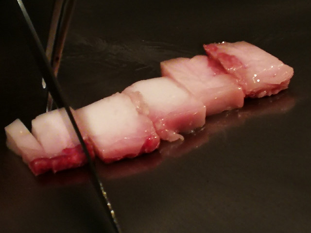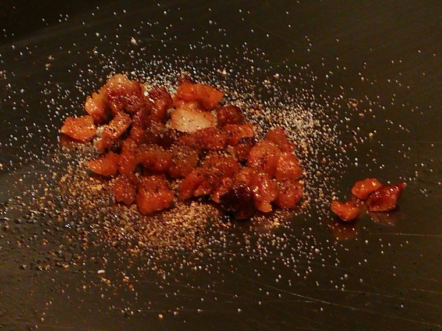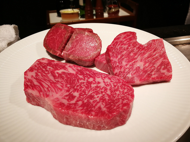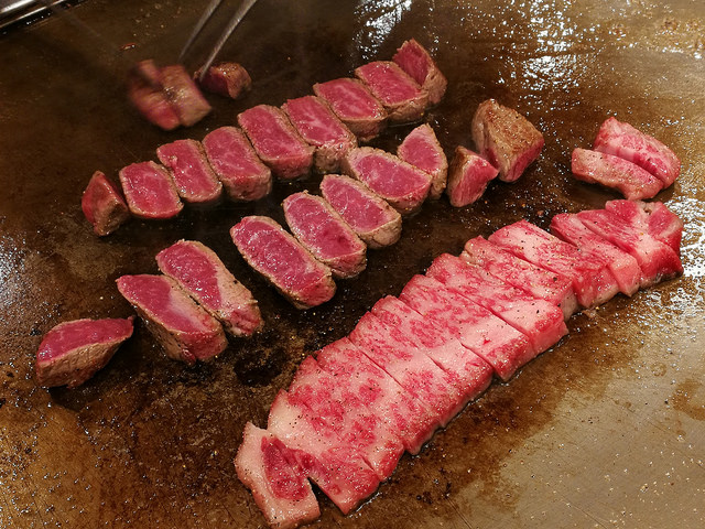 和Steakland一樣,神户牛的西冷和牛柳兩個部位都分別有普通和肉質更高級的版本。和友人點了較便宜的普通牛柳和西冷扒及一份高級的西冷扒,然後一齊分享着吃。就算是普通版的也比Steakland高級版的質素更高,而且Steakland 只是用普通的牛油來烹調,而這裏則用上原本牛肉上的脂肪來烹調,原汁原味,更覺酥香,但當然兩者的收費亦有所不同。上菜方面,很貼心的將三種肉質分開烹調,吃完一種再上另一種給我們品嚐,而且不會催趕客人進食,很明白食客的需要和感受。最後一道甜品是很香甜的草莓和橙,不知是否鐵板燒的坐席有限,我們移施到大廳進食。