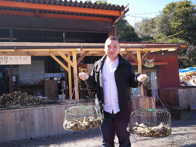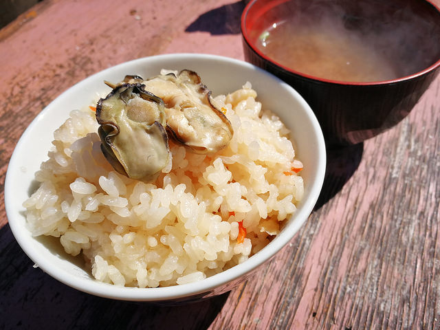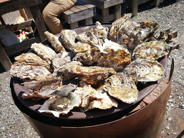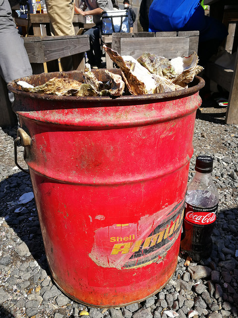 燒蠔的地方是一塊沿海的空地,擺放了很多由舊石油氣罐簡單製作而成的爐具及木椅。工作人員每次會提供一籠生蠔給食客燒來吃。店家建議燒10分鐘再揭開蠔殼燒2分鐘。喜歡吃生蠔的香港人會覺得生蠔過熟。但這裏的蠔場一般都建議這種安全的吃法,吃半生熟的比較少見,可能是基於衛生的問題吧。這裏的生蠔不算太大,但勝在是任食的,而且還附送一碗蠔飯和蠔湯。飲品方面可以在場內的自動販賣機買。原來日本人都喜歡自攜一些調味料例如醬油或醋來吃生蠔,建議大家可先到便利店或超市購買錫紙盤,再用芝士和牛油等來調味相信一定很好吃。當天我們沒有預先準備,便使用了店家收集的一些客人所剩下的調味料,加了些煮食用的甜酒和辣油來提鮮,味道也不錯吃。