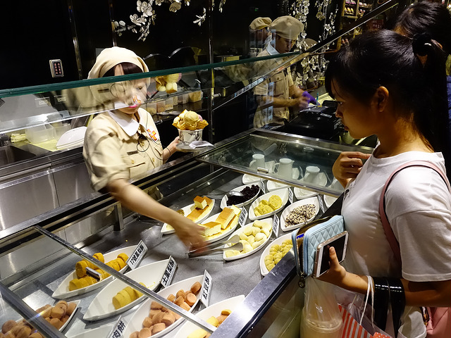 從古舊走進現代,一幢歷史悠久、以紅磚瓦構成的建築物 – 宮原眼科,於1927元由日本眼科博士宮原武熊興建,日治時期是台中的眼科診所,其後變成衞生院,再由兩位建築師及一位古蹟修復博士把其打造成台中知名食府。除了品嚐到冰淇淋、朱古力及珍奶,室內設計裝潢及日治時期的建築特色亦十分值得欣賞。宮原眼科的命運可謂一波多折, 921地震及颱風肆虐, 令她嚴重損毀, 直至2010年被台中鳳梨酥名店- 日出購入及裝修,紅磚瓦的外觀展現古舊情懷。而紅磚廊道也是適合拍照的好點。天花水晶吊燈、木色主調、微黃燈光,令室內裝潢充滿華麗及古典氣息,水平線以上的是巨型書架, 古舊書藉堆疊擺放,在這個氛圍下吃著自選冰淇淋,是怎樣的感覺?