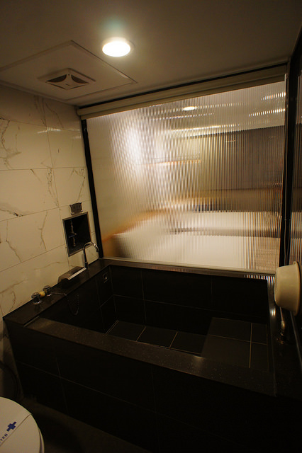 浴室盥洗設施乾濕分離,白色雲石紋街磚的牆身配上溫旅房間獨有的黑色大理石砌成的雙人浴池,令其感覺更顯高雅。