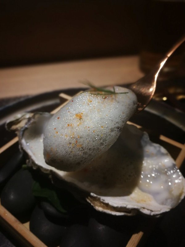 超大隻的日本生蠔,面頭是用絲瓜高湯所打成的白色泡沫和粉色的櫻花蝦乾粉末點綴。鮮甜順喉的生蠔帶淡淡的絲瓜清香,咬下去,原來還藏了幾顆飛魚子,在口中一粒一粒的爆開。